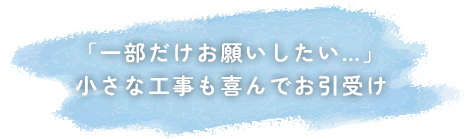 小さな工事でも、ご依頼頂いたお客様のご満足を追求いたします。外壁の一部分の塗替えなどの工事も大歓迎ですので、少しでも気になる箇所がございましたら、ご遠慮なくご相談ください。